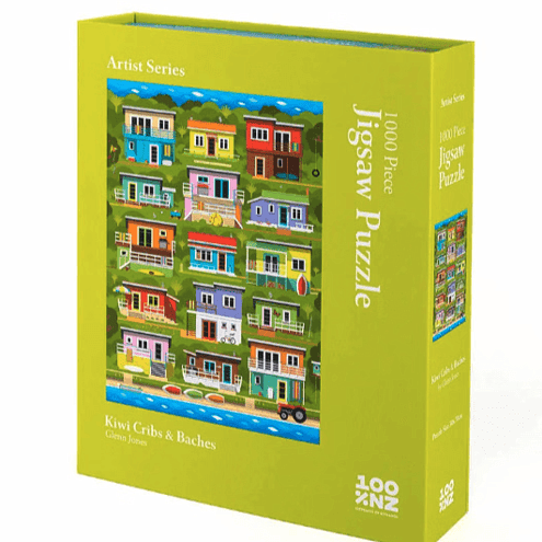 Explore the relaxed charm of coastal Aotearoa with our Artist Series 1000-piece jigsaw puzzle, Cribs & Baches by Glenn Jones.