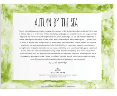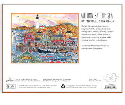 - Award-winning designer, illustrator, and creative director Michael Storrings beautifully illustrates a New England Seaside town in the Autumn in Michael Storrings Autumn By the Sea 1000 Piece Puzzle.