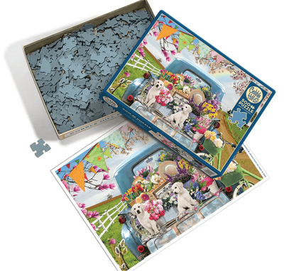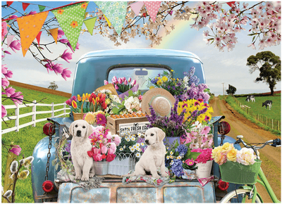 The Country Truck in Spring is full of colour with beautiful flowers, ribbons, and rainbows! A cheerful 500 piece puzzle equipped with cuddly puppies.