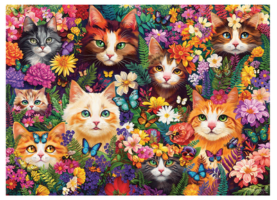 - Look at all the beautiful "Blooming Whiskers" in this playful 1000 piece puzzle. An enchanting scene of cats nestled among a burst of colourful flowers and butterflies.