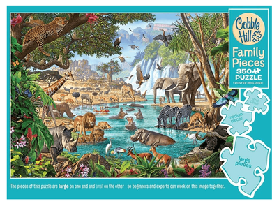 - Family Pieces 350 puzzles include three different piece sizes so puzzlers of all skill levels can collaborate.