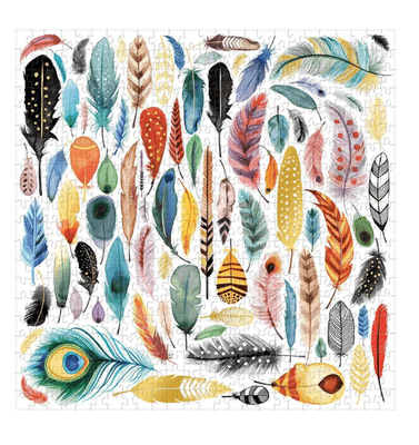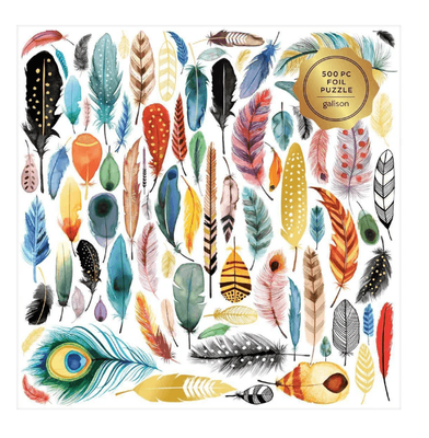 - Feathers 500 Piece Foil Puzzle features vibrant watercolor feathers from artist Magrikie Berg. Gold foil accents create a stunning pattern of plumage that comes together piece by piece.