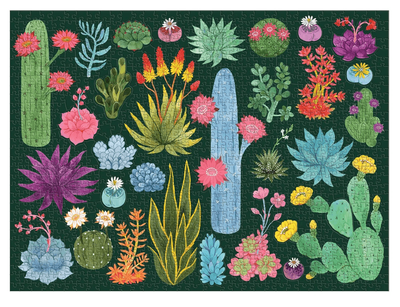 - The Desert Flora 1000 Piece Puzzle with Shaped Pieces from Galison features illustrations of the desert's colorful plant life.