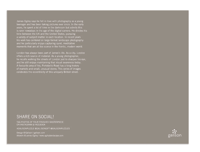 - A favorite area of photographer James Ogilvy, his Portobello Road puzzle celebrates the eccentricity of this unique London street with its long history of markets and small, unusual stores.