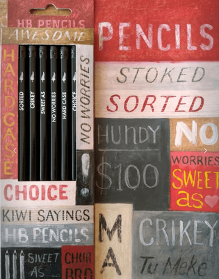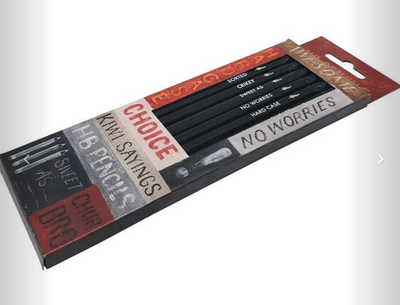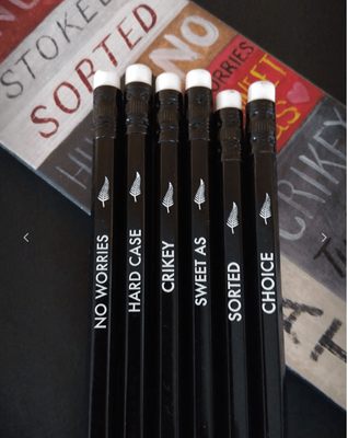 6 eraser tipped pencils uniquely printed in with Kiwi sayings. Designed by Tanya Wolfkamp.