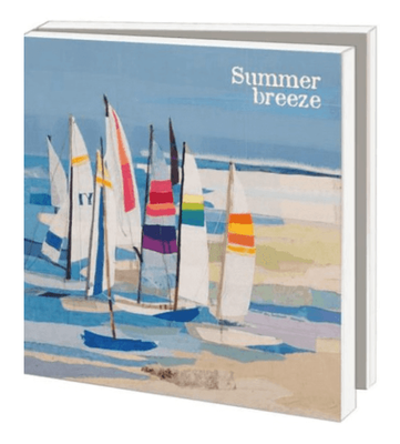 - The "Summer Breeze" notecard set by Bekking & Blitz features a beautifully illustrated scene depicting sailboats on a serene beach, evoking a sense of tranquility and summer leisure.