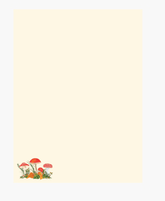 - Each letter sheet features a vibrant woodland design in the lower left corner, with mushrooms, leaves, and ferns against an ivory background.