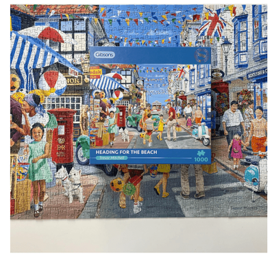 Sunbathing, swimming and sandcastle building are on the agenda and maybe an ice cream later if everybody behaves!This 1000 piece jigsaw puzzle has been painted by the talented artist Trevor Mitchell.