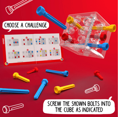 - 1 cube, 4 short red bolts, 4 medium yellow bolts, 5 long blue bolts, challenge booklet with 90 3D challenges and solutions.