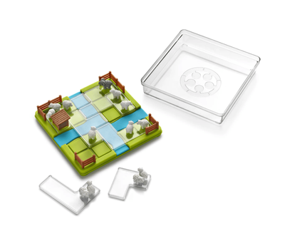 - Compact game board with lid, 7 transparent puzzle pieces with 12 sheep and 1 ram, 1 puzzle piece with a shed, challenge booklet with 60 challenges and solutions, leaflet with game rules.